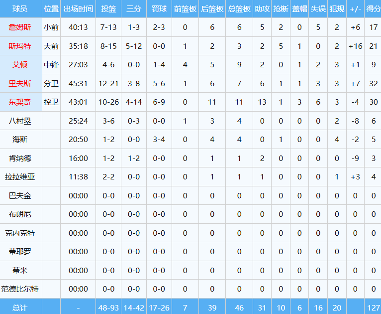 湖人四人得分上双,东契奇30分11板13助3帽,里夫斯32分7板6助,詹姆斯17分6板5助2断,斯玛特扔进5记三分球轰下21分3板2助5断。